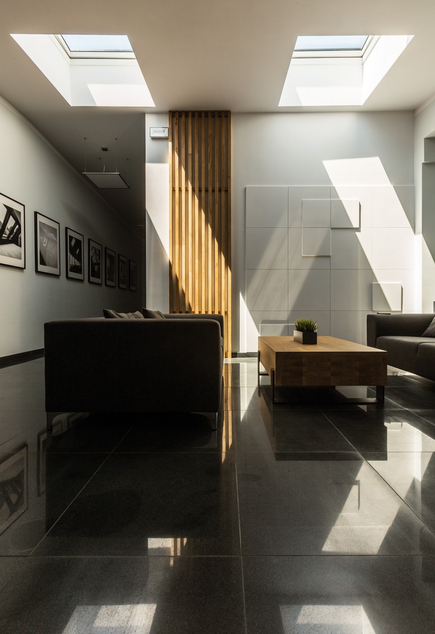Das große innenarchitektonische Potenzial des Dachgeschosses resultiert aus seiner ungewöhnlichen Form, die durch die vielfältige Konstruktion der Dachschrägen bestimmt wird. Eines der wichtigsten Elemente des Interieurs ist das Licht, das neben der Optik einen großen Einfluss auf die Stimmung im Gebäude hat.