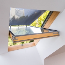 Im Fokus steht der lichtdurchflutete Dachgeschoßausbau mit über 50 GreenView-Fenstern, einem flach verglasten Brandrauchfenster und einer technischen Neuheit: einem durchgehenden, solarbetriebenen Außenrollladen für zwei Dachflächenfenster.